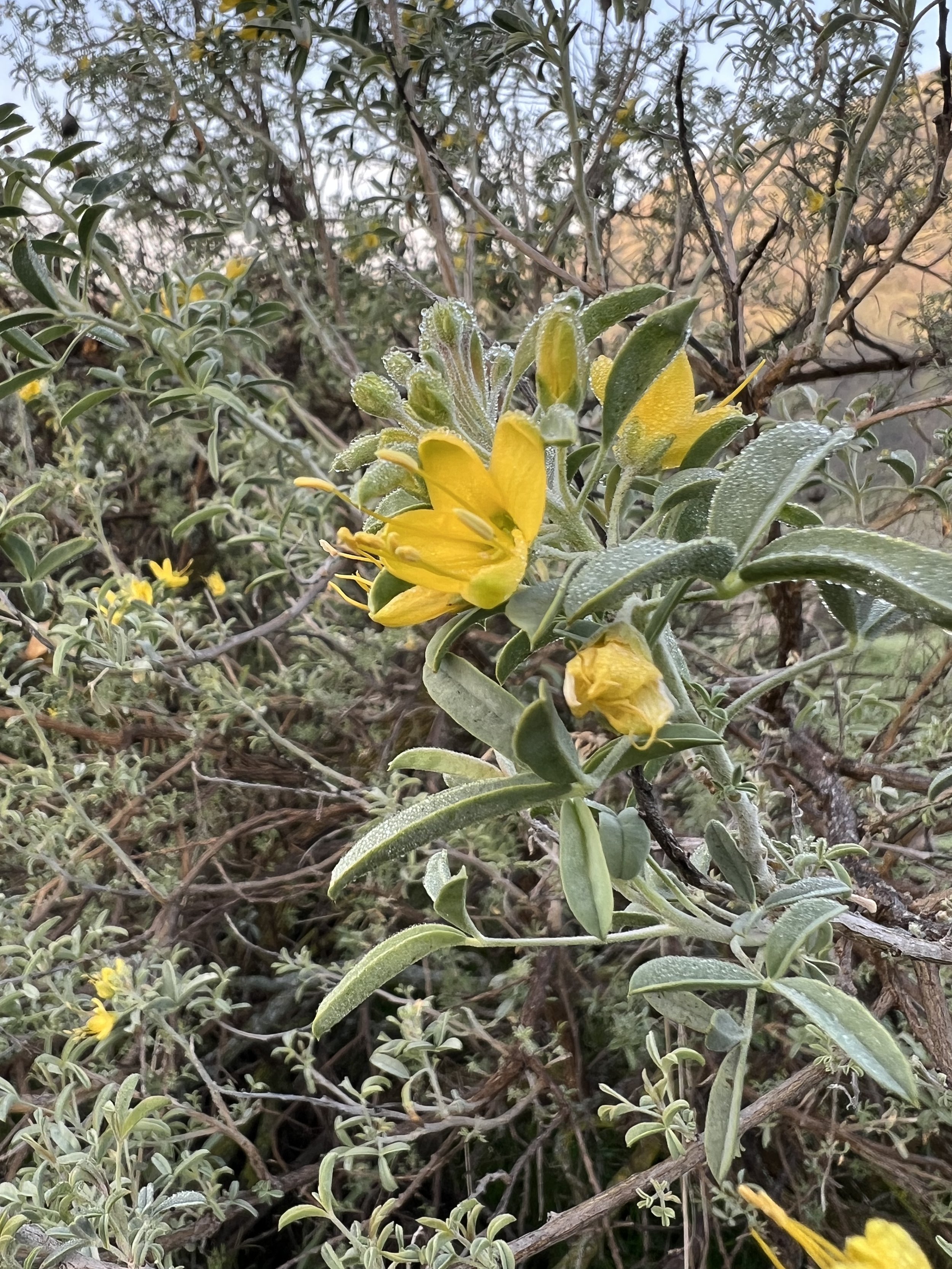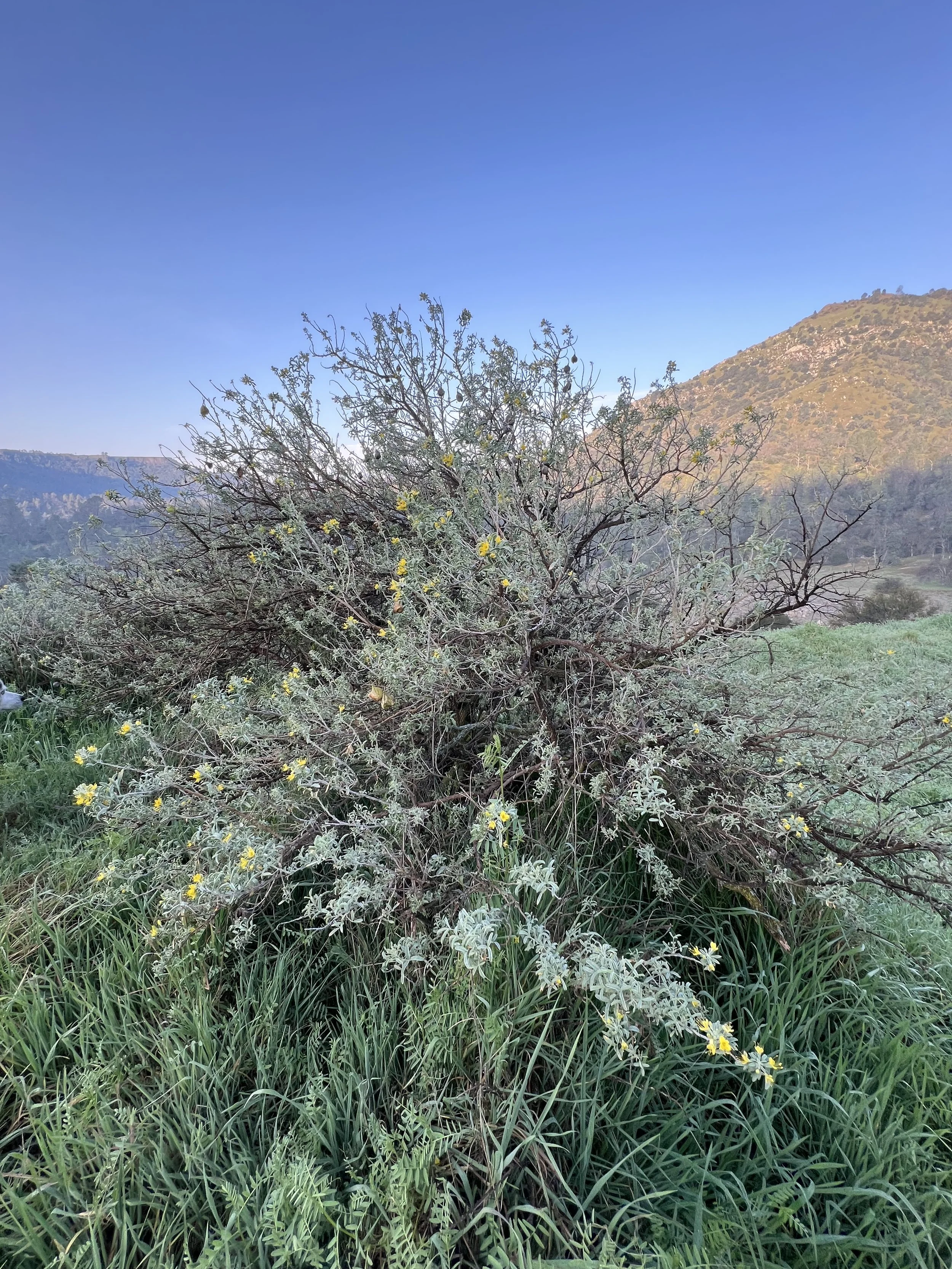 On a recent walk down from the Powerhouse toward the caves, there were bright shrubs perched along the steep upper slope, glowing against the winter afternoon. Peritoma (Cleomella) arborea, Bladderpod in full bloom here in the Gorge. A plant more commonly tied to Southern California and Baja, not something you expect to encounter in Fresno County, and actually there are still no official records of it in eastern Fresno County.