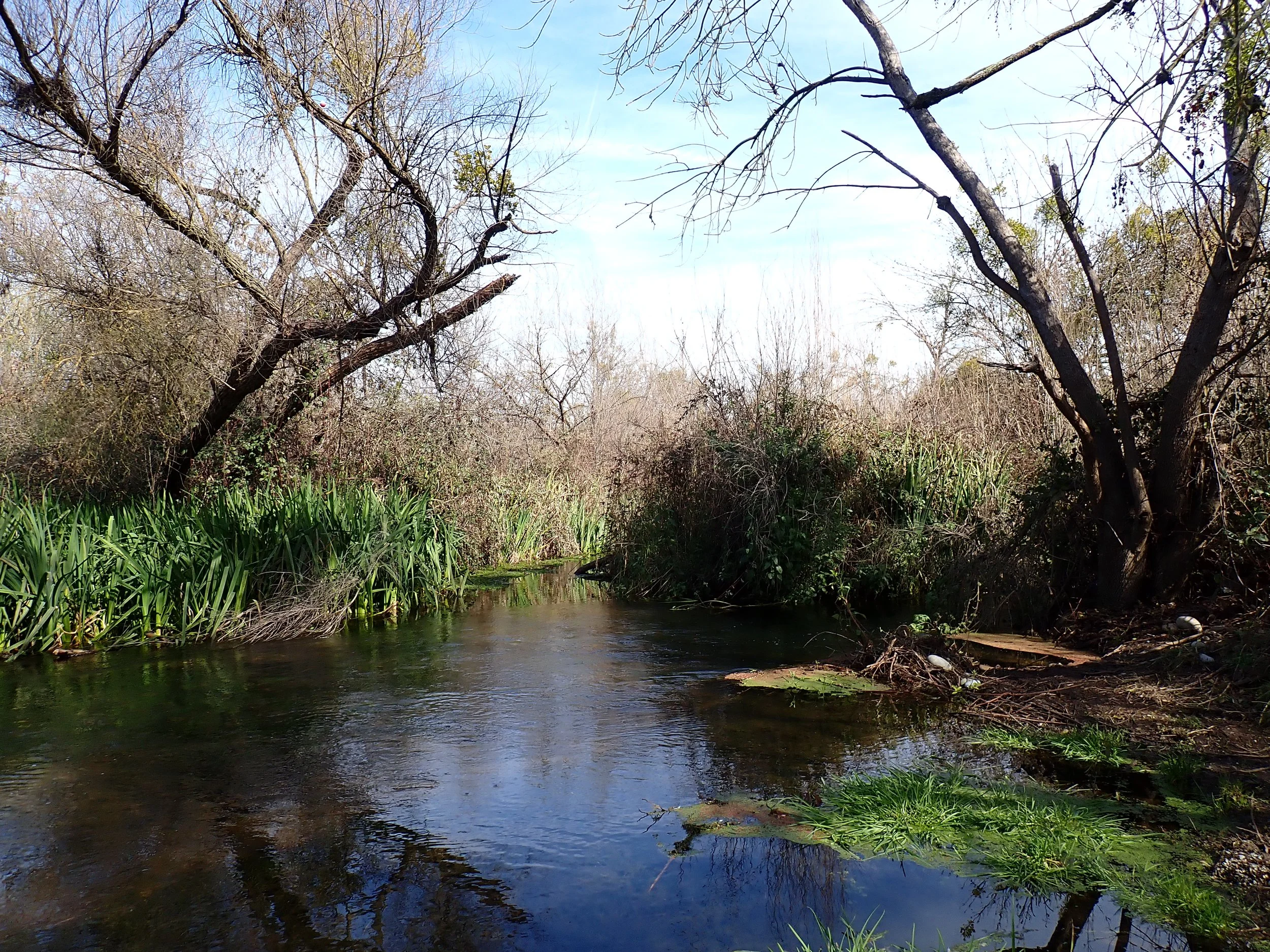 From SCARF the trail leaves the managed basins and enters the actual river corridor. Cottonwoods, valley oaks, mulefat, Artemisia, and willows line the banks moving into the riparian system.