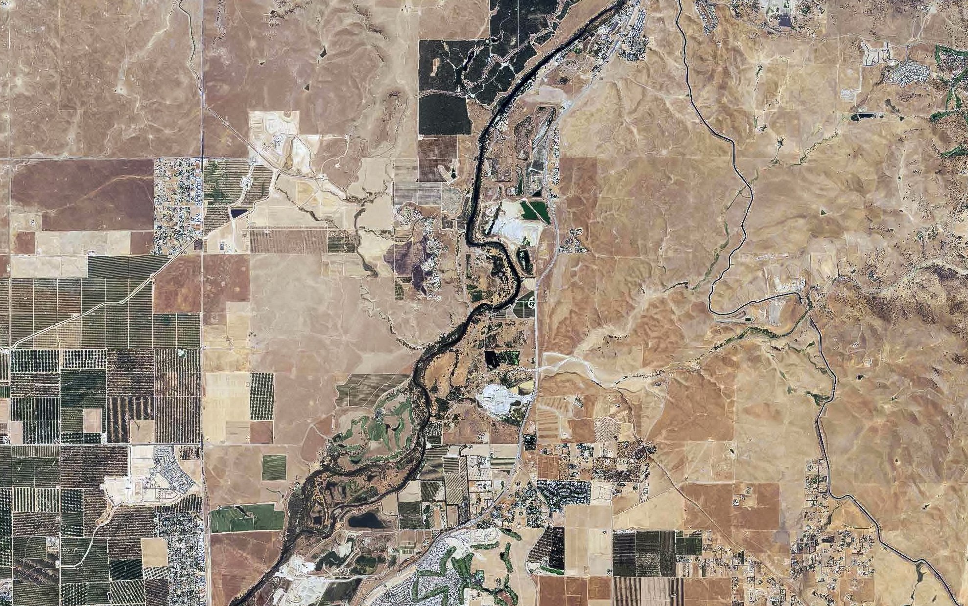 Fig 25. Aerial view of the San Joaquin River corridor from Friant Dam downstream toward the Fort Washington area. The light spots along the Fresno County (right) bank are active and former gravel mining operations which limit public access and have significantly altered floodplain ecology