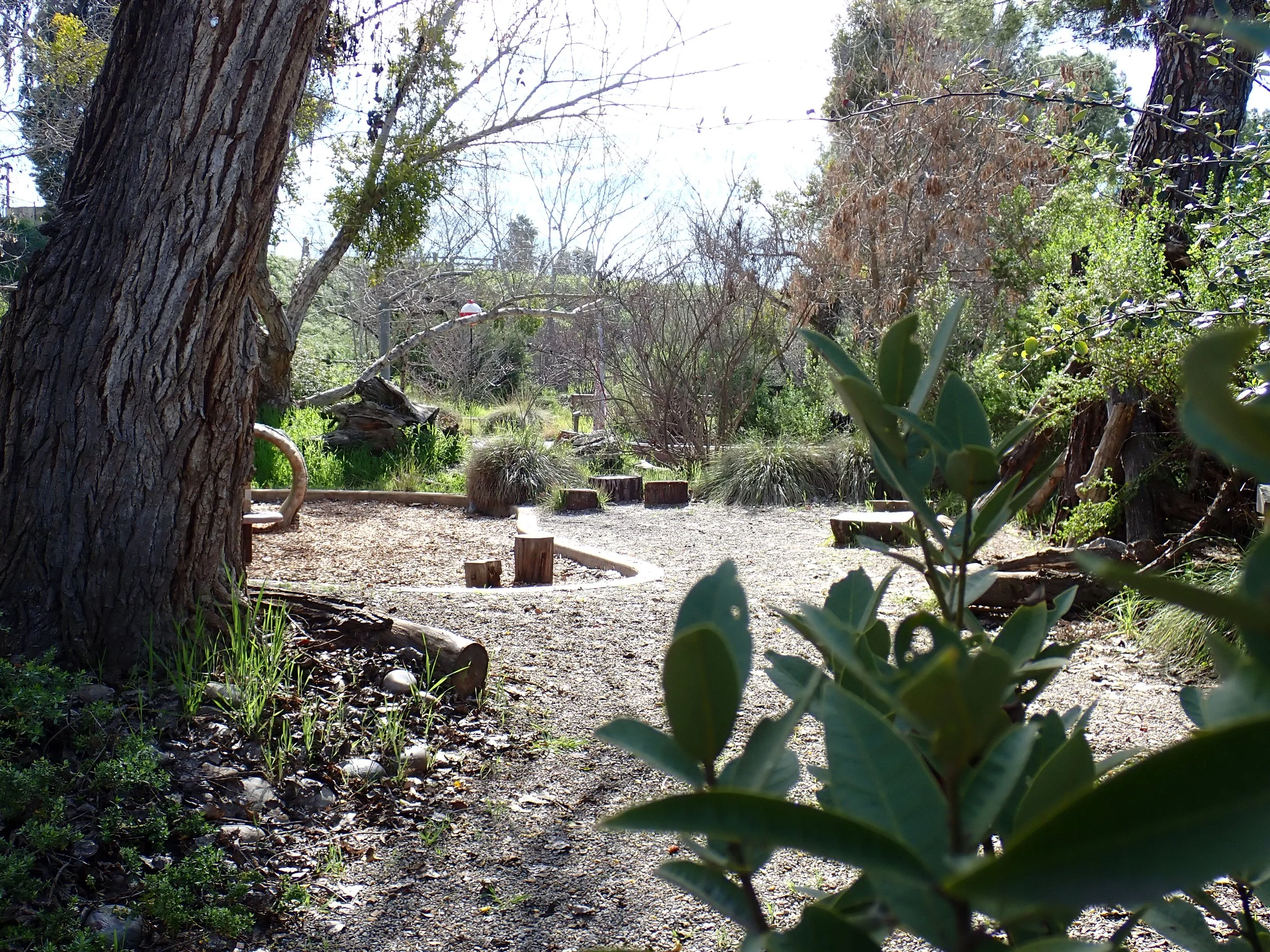 Fig 3. View into one of the interactive areas on the Small Fry trail with Deergrass, Ash trees, Bay laurel, and other native plants