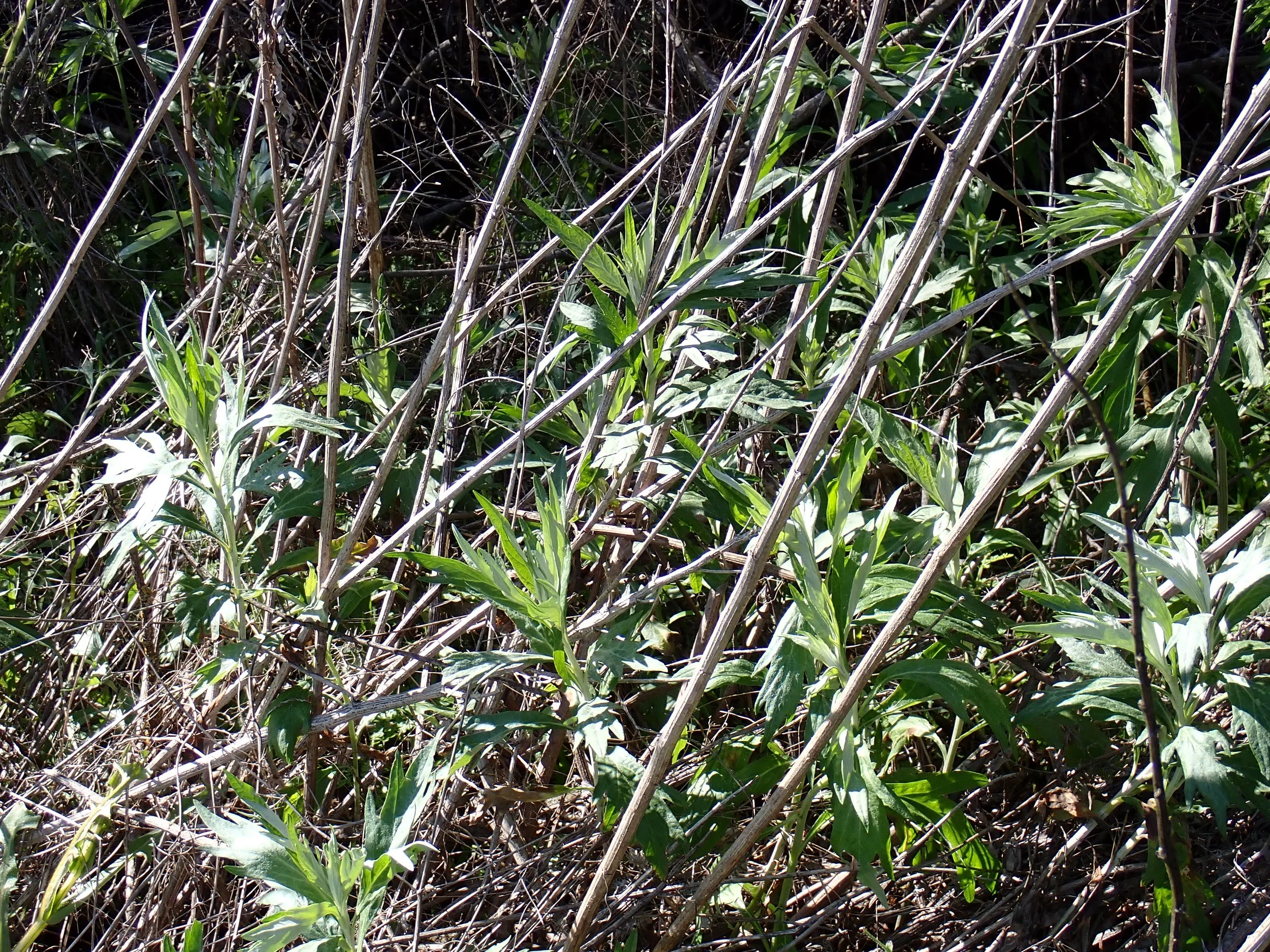 Fig 22. Artemisia douglasiana (mugwort) emerging from winter dormancy along the riverbank, a native species well suited to this site