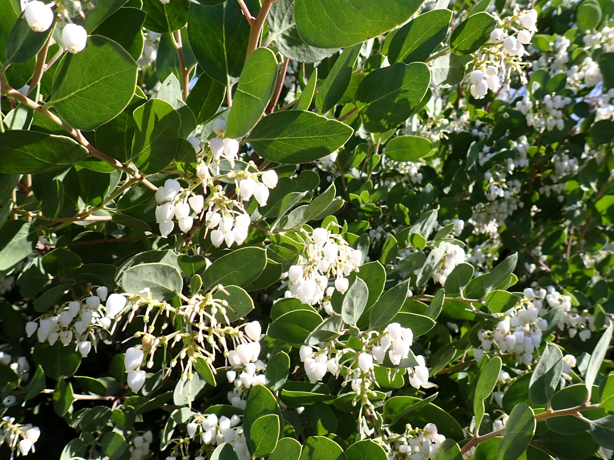 Buckwheats (Eriogonum spp.) are planted throughout the site. Their drought-adapted roots tolerate high summer heat while providing nectar resources for pollinators. Toyon are well established in portions of the garden, and this time of year they are packed with red fruits that support cedar waxwings, robins, and countless overwintering birds.