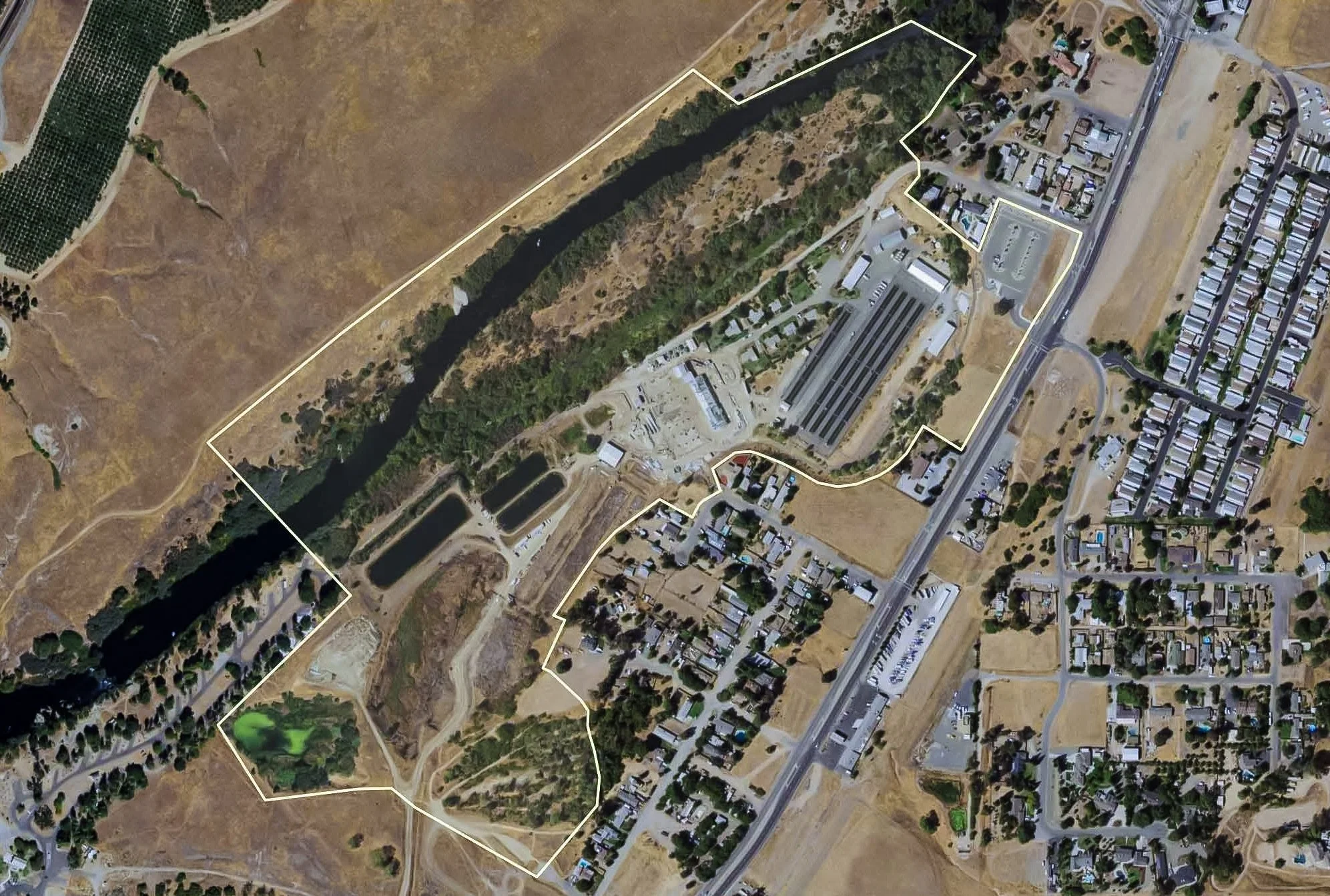 Beyond the interpretive site, the trail passes a series of discharge ponds. These are managed basins that receive facility outflow before water is returned to the San Joaquin River. These ponds slow water movement, allow suspended sediments to settle, and create opportunity for biological uptake before entering the main channel.